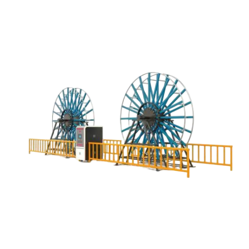 测试设备由两套轮组、两套独立动力单元、控制单元、辅助导轮等部分组成。双轮“∞”型收放线。双轮均具有动力,使用直流电机驱动,并均可四象限运行。双轮可快速切换收放线功能,恒速度收线,恒张力放线。系统根据试验要求,输入速度,试样直径。自动弯曲试验机解决35Kv及以上高压、超高压电缆的型式试验中第一项“弯曲试验”,存在的样品挠性大、重量大带来的试验人员操作难度和危险性,弯曲轮外径变化大、试验器具多等方面问题。具有可操作性强,操作简便,制造精良、性能可靠、适用线缆范围广等特点。